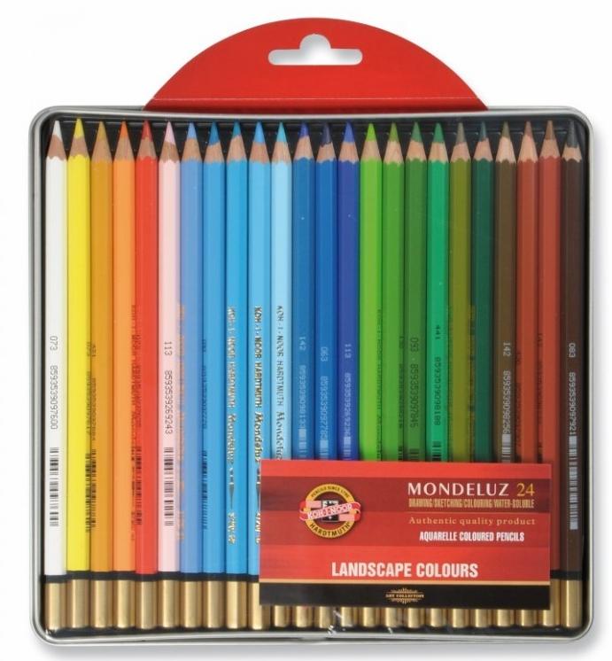 Creioane colorate acuarela, 24culori/set, cutie metal, Peisaj Mondeluz Aquarell, Koh-I-Noor