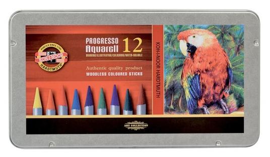 Creioane colorate acuarela, fara lemn, 12culori/set, cutie metal, Progresso Aquarell Koh-I-Noor