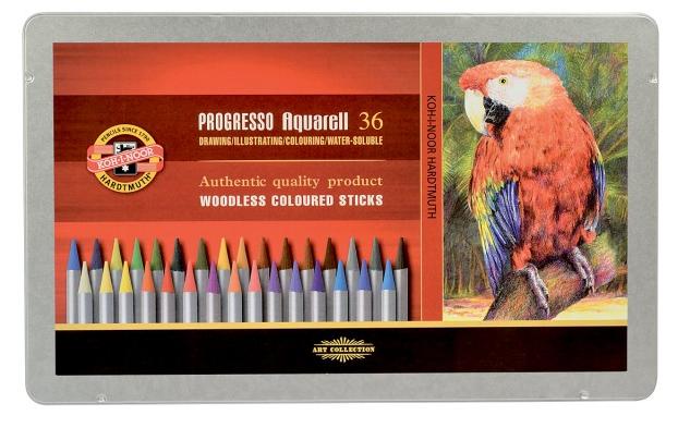 Creioane colorate acuarela, fara lemn, 36culori/set, cutie metal, Progresso Aquarell Koh-I-Noor