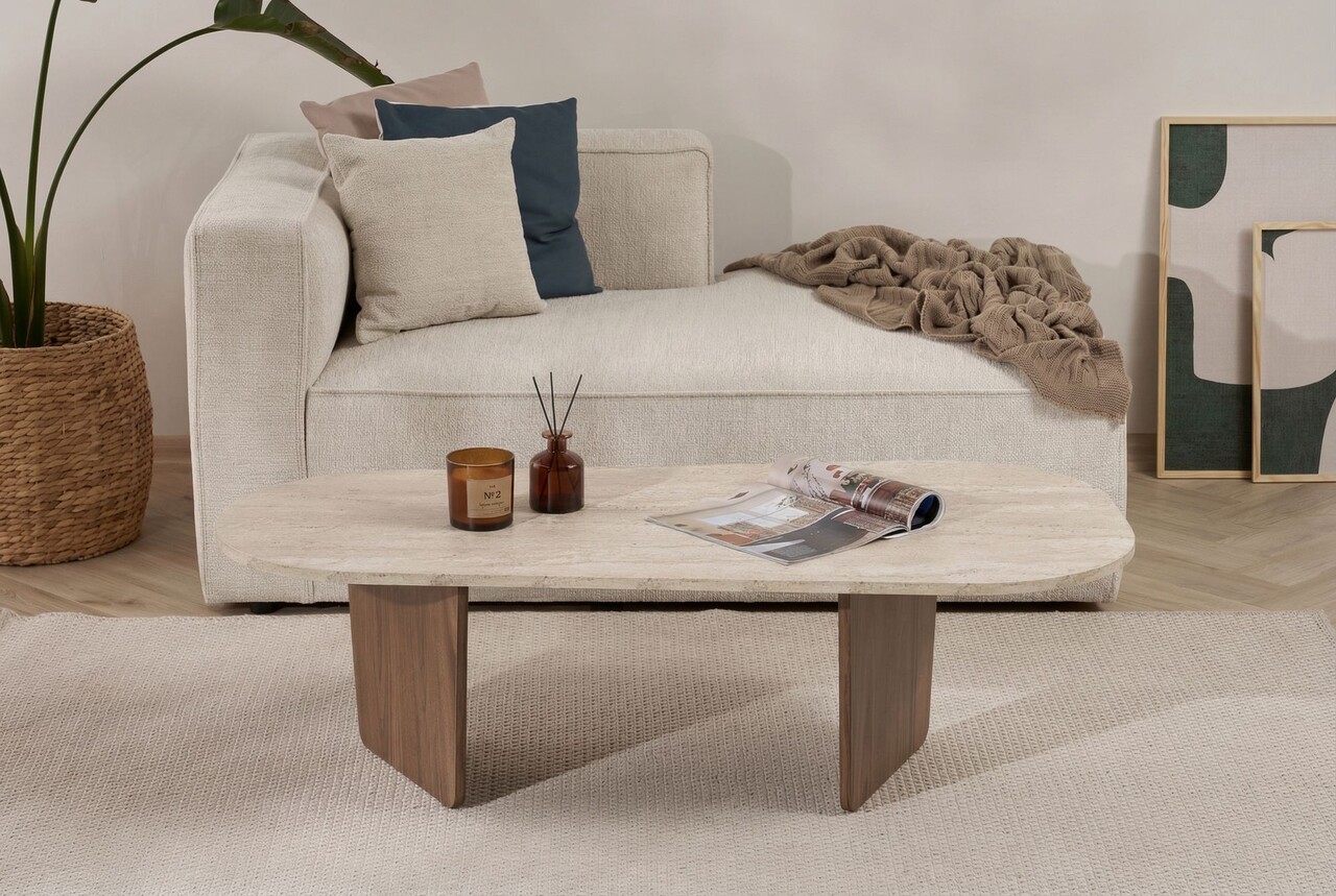 Masuta de cafea, Hanah Home, Ovalis, 130x40x65 cm, Travertin / Nuc