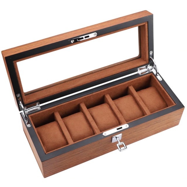 Cutie caseta din lemn pentru depozitare si organizare 5 ceasuri, model Pufo Elite Edition cu cheita, maro