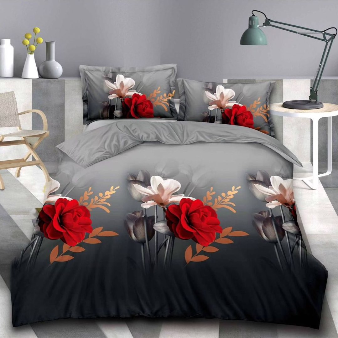 Lenjerie pat dublu imprimeu 3D - 3 Bucati 219 Lei - Gri-Rosu flori