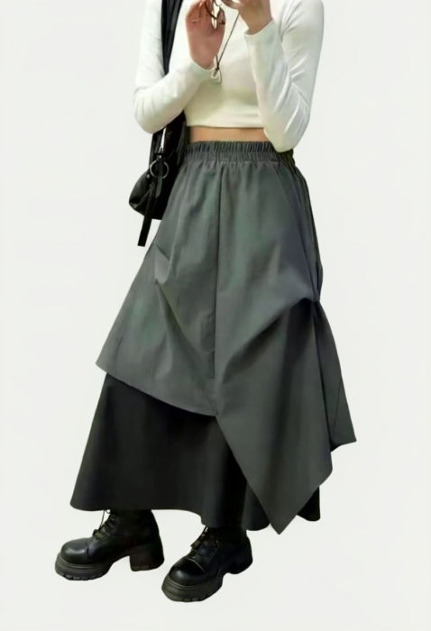 Fusta midi asimetrica cu suprapuneri, gri peste negru