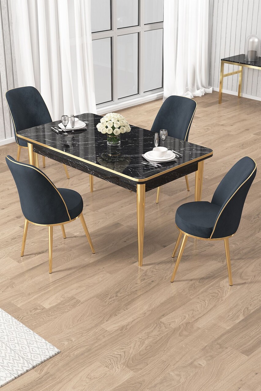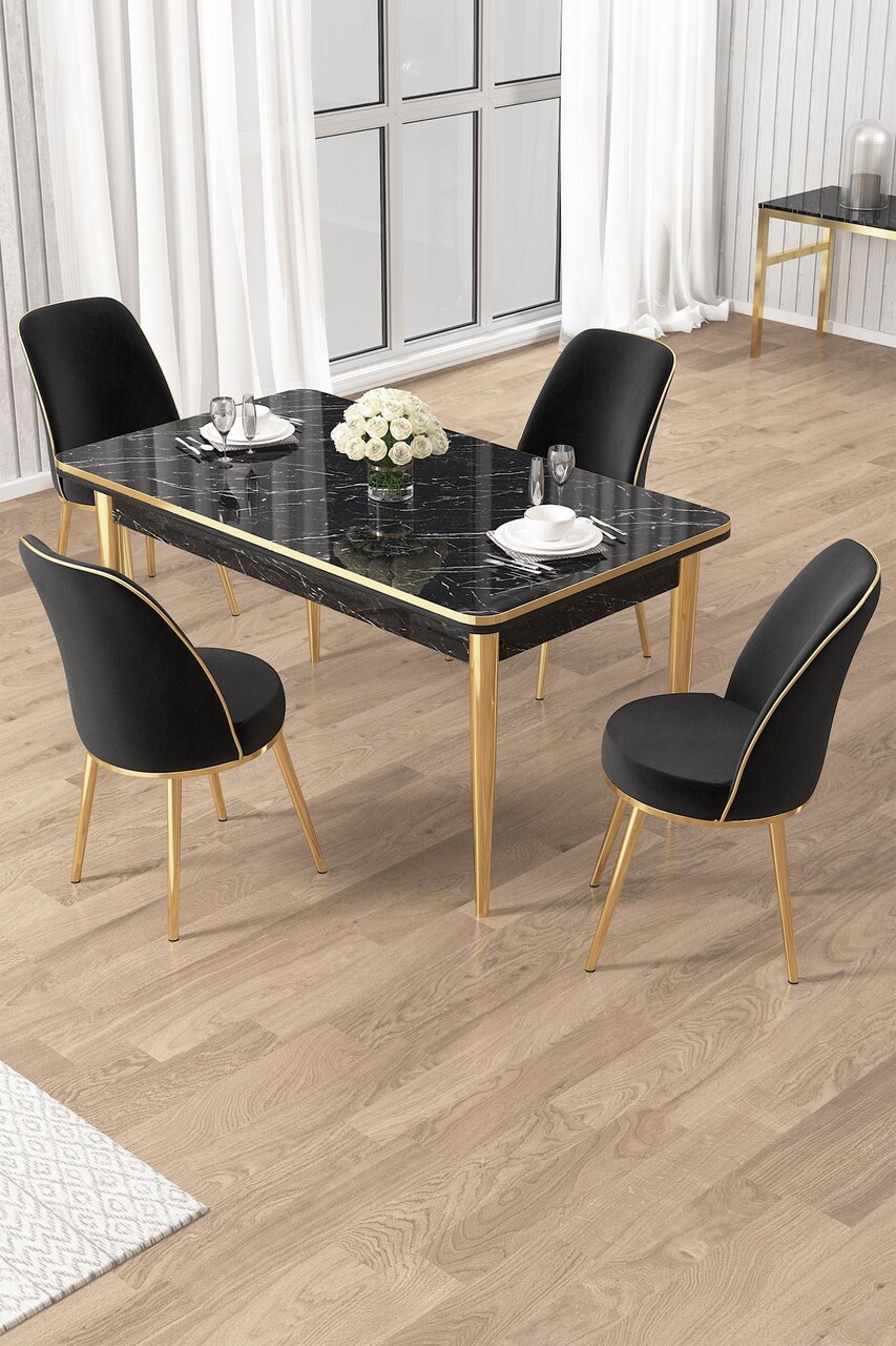 Set masă și scaune (5 bucăți), Hanah Home, Rewa, Marmură neagră / Auriu / Negru
