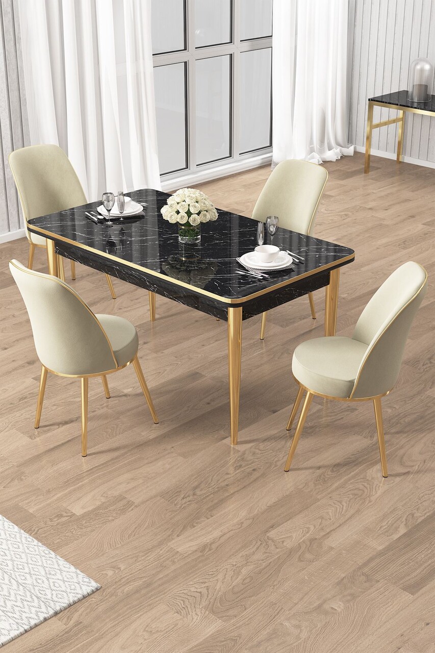 Set masă și scaune (5 bucăți), Hanah Home, Rewa, Marmură neagră / Auriu / Crem