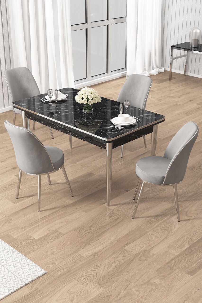 Set masă și scaune (5 bucăți), Hanah Home, Rewa, Marmură neagră / Crom / Gri