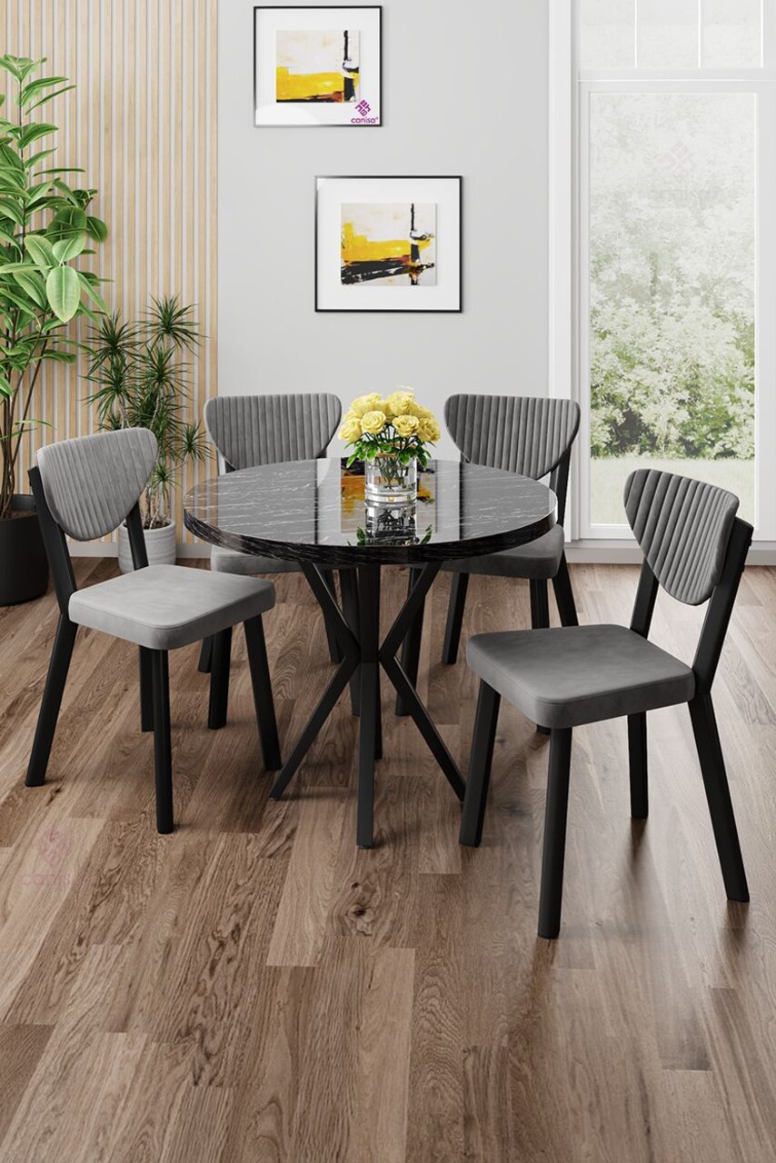 Set masă și scaune (5 bucăți), Hanah Home, Rewa, Marmură neagră / Crom / Antracit