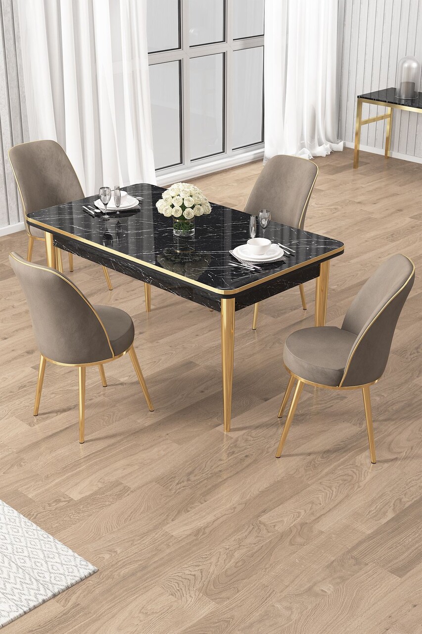Set masă și scaune (5 bucăți), Hanah Home, Rewa, Marmură neagră / Auriu / Cappuccino