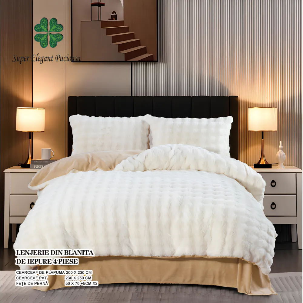Lenjerie pat dublu, ExtraPufoasa, din Blanita artificiala de Iepure, 6 piese - Alb