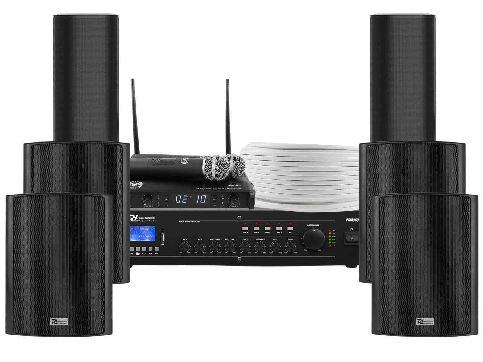 Sonorizare biserica pentru interior-exterior, statie cu 2 microfoane wireless, amplificator, 4 boxe perete, 2 difuzoare PA, KITBIS6040B
