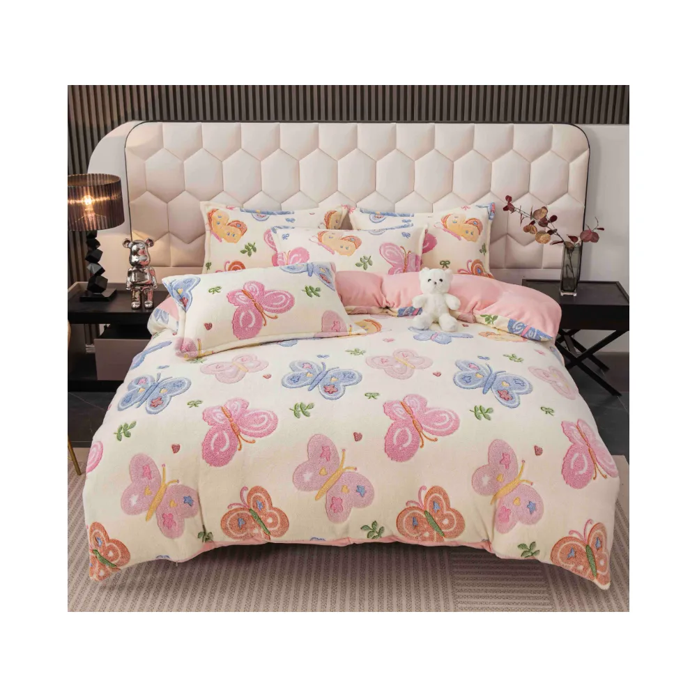 Lenjerie Cocolino 4 Piese Pentru Pat Dublu cu Elastic- JOJ811 Fluturi Roz