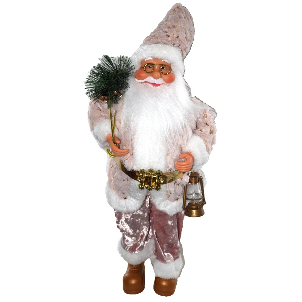 Figurina Mos Craciun, cu saculet si felinar, 45 cm, roz