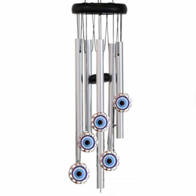 Clopotel de vant Pufo cu 5 tuburi sonore metalice pentru casa sau gradina, model Ochiul lui Fatima, argintiu