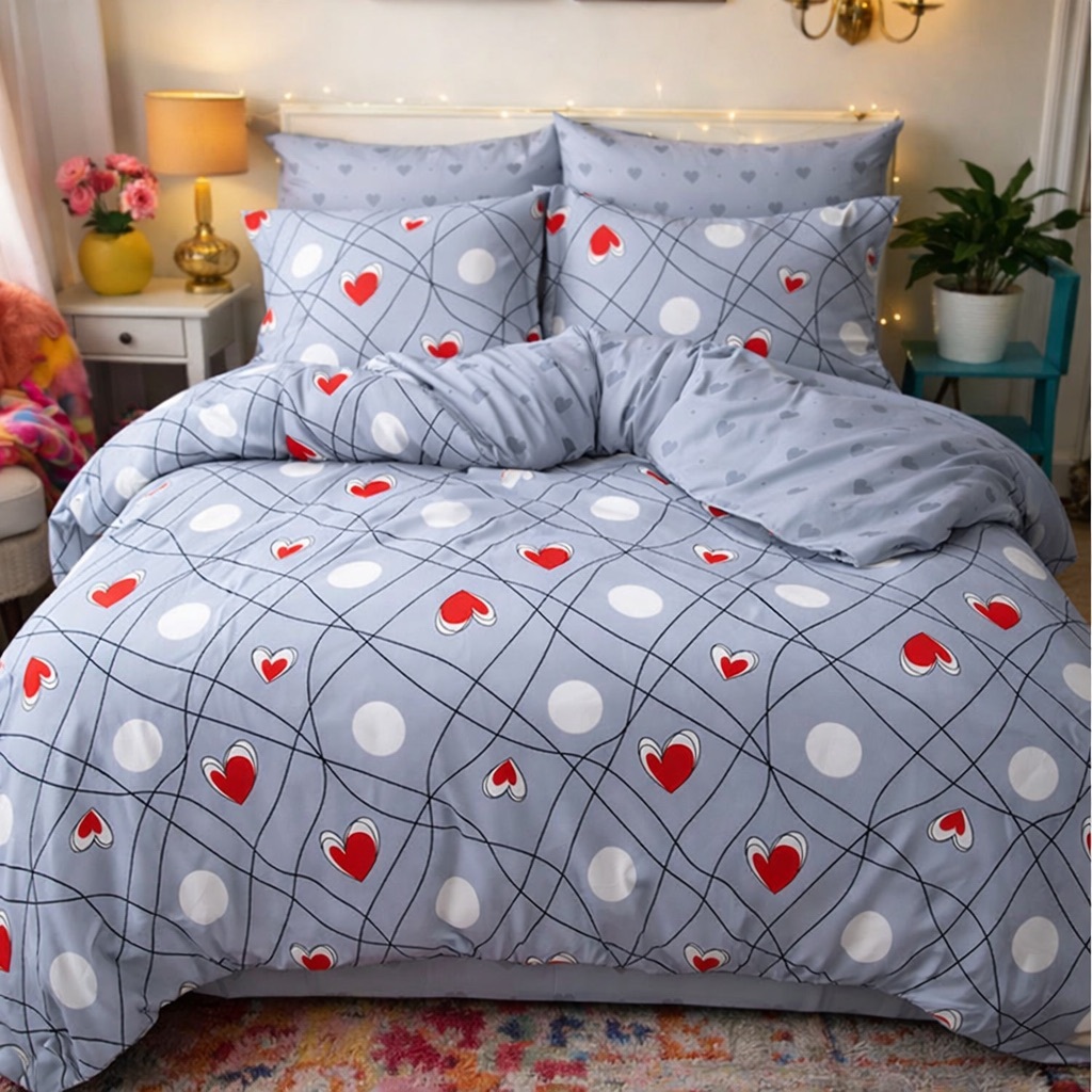 Lenjerie pat dublu, Finet, 6 piese, Gri, inimioare, buline